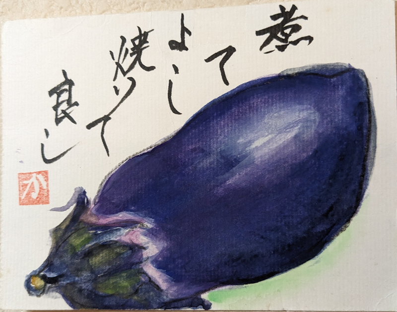 恐れ多くも全国の会報に載せて頂くことになりびっくりしております。陶芸を習っていましたので、ちょっと絵が描ければ、個性のある作品ができると思い絵手紙を習うきっかけになりました。「蔕(ヘタ)がいい、下手がいい」と。普段スポットが当たらない野菜などの蔕(ヘタ)を描くことが絵手紙の面白さと言われています。家庭菜園で美味そうな茄子が採れたので茄子を描いてみました。