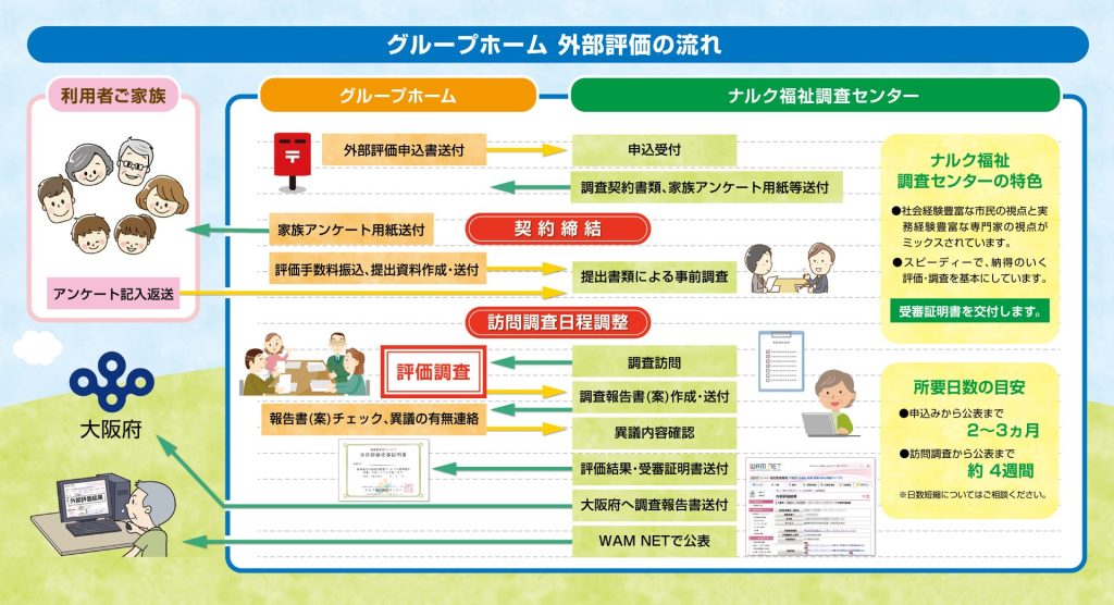 認知症対応型共同生活介護事業を行うグループホームを対象に、施設が行う自己評価をもとにナルクの訪問調査員が調査を行い、施設運営やサービス面の優れている点や今後の課題を明らかにし、この評価結果を公表することで、サービスの改善につなげるとともに、新たに施設を利用しようとする方々への情報提供を行います。
