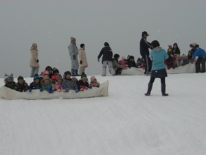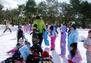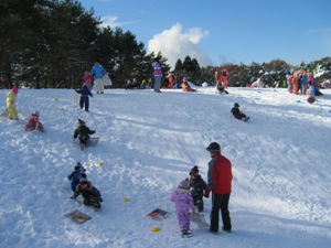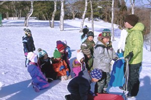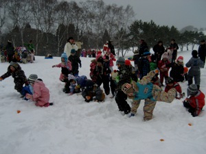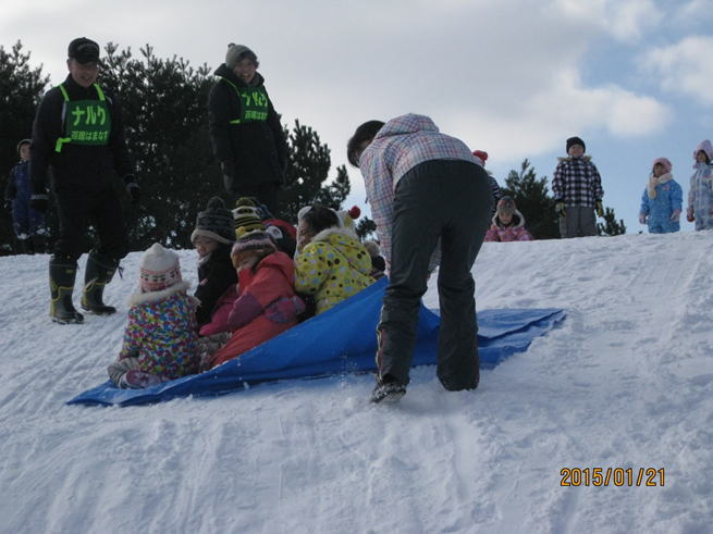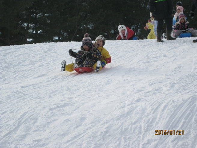 | 1月26日快晴の中、「上湯川保育園」の園児(3〜6才)50名と「香雪園」で約2時間そり滑りを楽しみました。・・・孫(4才)の姿をダブらせながら。 転んで雪まみれになりながら、大はしゃぎする園児の成長に驚くばかり、野リスの出迎えもあり、我々も久しぶりに童心に返って楽しい一時でした。 |