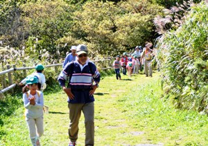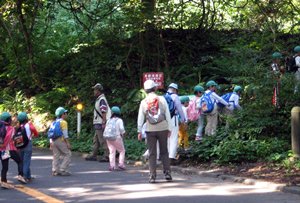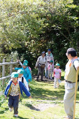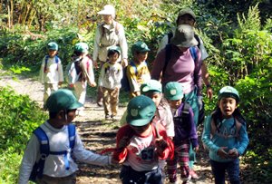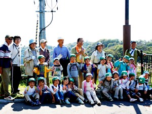 | 剱物副代表ほか4名がサポート隊として参加しました。お天気も晴れ上がり、初秋の函館山登山口は園児の皆さんを迎えてくれました。 (年長さん5才児)16名は、先生の“元気で登るゾー。エイエイオー。エイエイオーで、9時40分出発です。約1時間後の10時45分全員元気に頂上に到着です。頂上では、ペットボトルのお茶などを飲みひと息入れました。 防護柵につかまり遠望の「下北半島」を眺めていたリーダー格のT君が突然“ガンバレ福島・ガンバレ日本”と大きな声で叫びだしました。みんなで大合唱です。 来年1月に「香雪園」で行われる「雪遊び」での再会を約し、お別れしました。 |