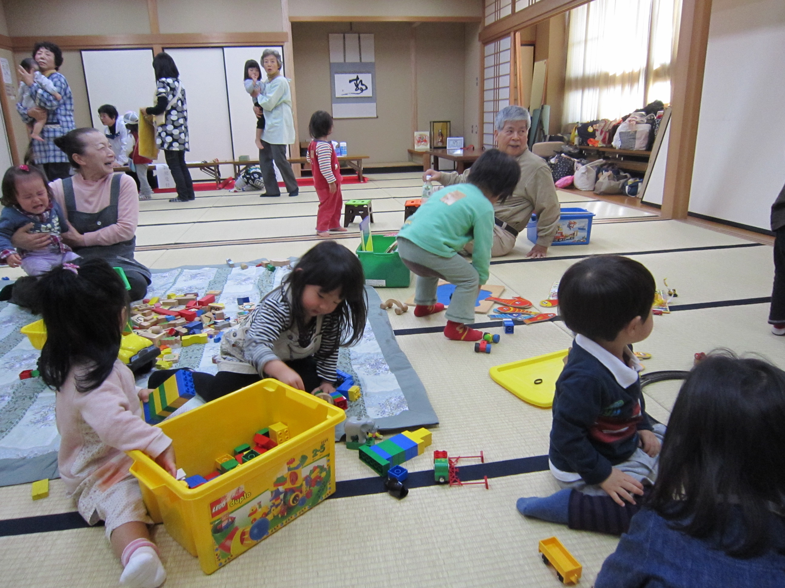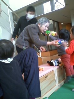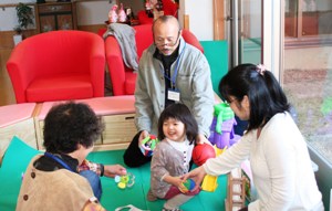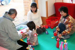 岐阜県の「地域子育て創生事業」の一環として、毎週月曜と水曜日の10時〜14時まで、未就学児(0歳〜6歳)、そのお母さん、そしてナルクのじいじ、ばあばが一緒に手遊び、歌、紙芝居などで楽しく交流しています。