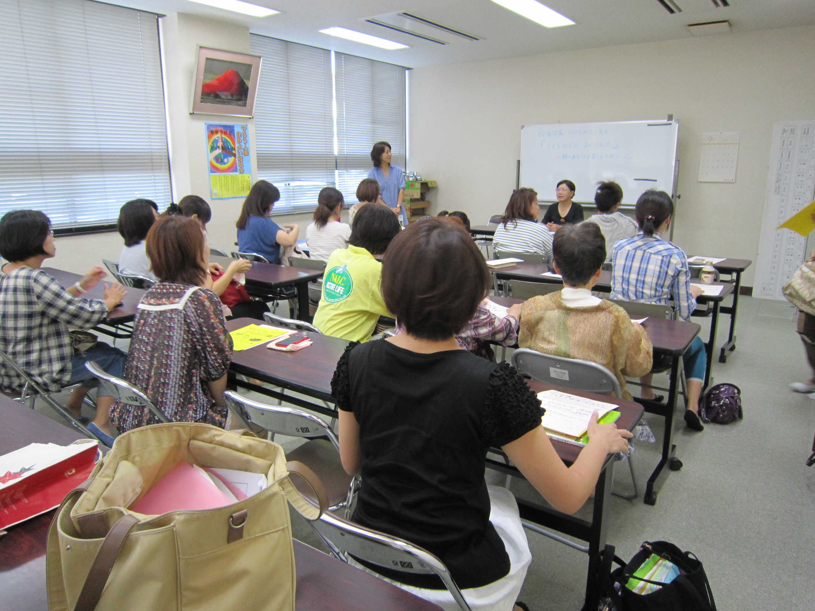 9月19日には、絵本作家「ひぐちみちこ先生」の子育てのお話し会に6名が参加、一方託児支援は8名のナルク会員が担当しました。