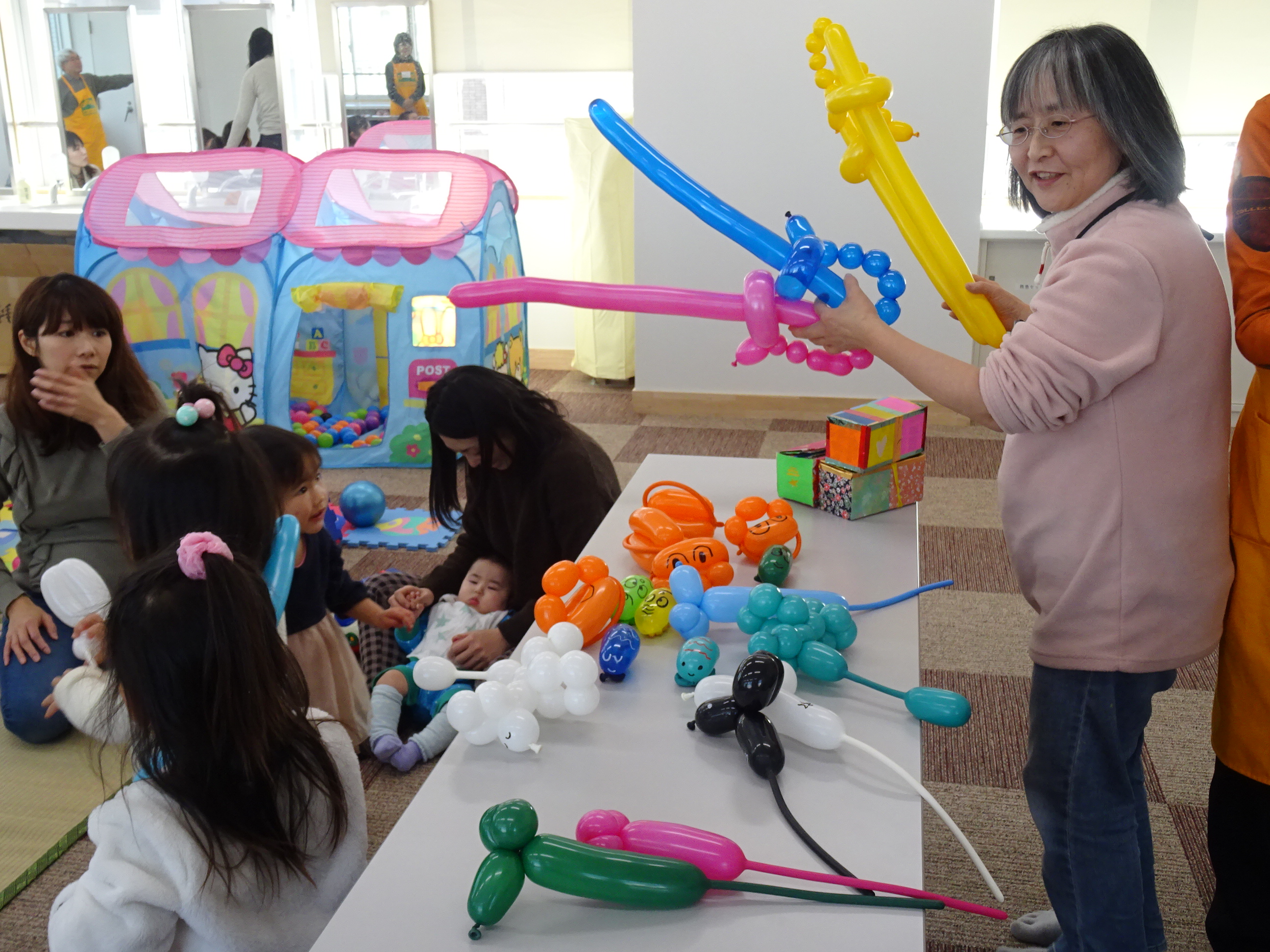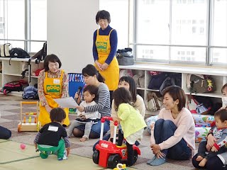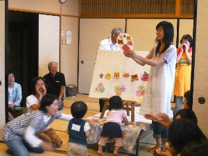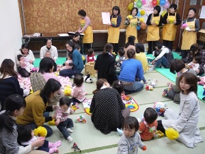 | 草津市と守山市で実施している子育て支援「ふあ・ふあ」は来場のお母さんと子どもたちに毎回笑顔で楽しんでいただけるよう通常時の「歌」や「紙芝居」「パネルシアター」などに併せ「チビッコ運動会」「七夕」「ハロウィン」「クリスマス」といった時節に合わせたイベントを企画し、来場者とお世話する会員が一つになった時間が過ごせるよう工夫を凝らしています。 | |||||