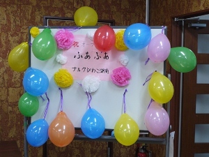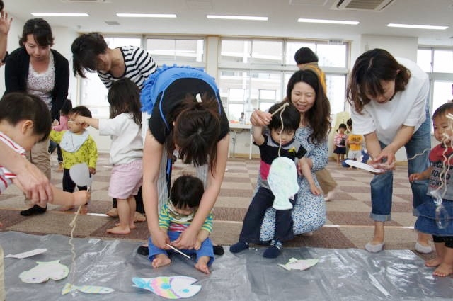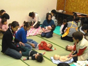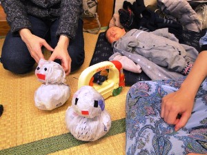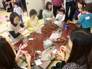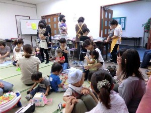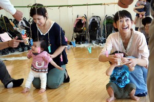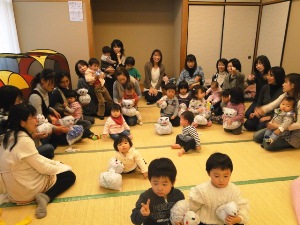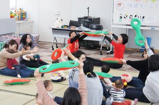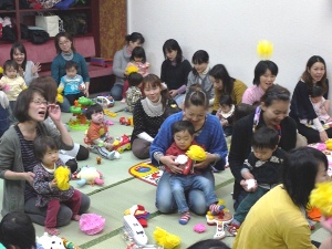 | 子育て支援「ふあ・ふあ」の取り組み 3歳迄の乳幼児を対象とした「子育て広場」を草津会場と南草津会場で毎週開催し、合わせて乳幼児が年間延べ880人参加しています。 季節に合った行事を考えて、新聞紙を使った雪ダルマ作り、兜作り、七夕飾り、ハロウイーン、クリスマスリースを作り、また年2回は室内運動会とフラダンスを行っています。 毎月童謡を歌い、ベビーマッサージ、絵本の読み聞かせ、パネルシアター、誕生会を開催しています。ナルクの中高年会員が子供達と遊んで元気を貰っています。 |