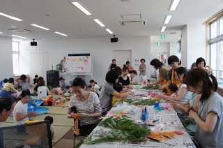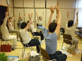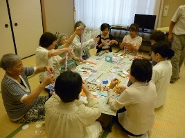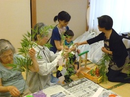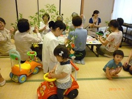 | 「多世代交流子育てサロン」への取り組み H24年7月 子育て支援「ふあ・ふあ」に地域の高齢者も参加いただき「多世代交流子育てサロン」へステップアップすることは、びわこ湖南のかねてからの目標です。そのため草津市が推進する介護予防「いきいき百歳体操」を毎週「ふあ・ふあ」と同会場で開催することを計画し4/19(木)からスタートしました。近隣の多くの高齢者から申込がありましたが、現在定員10名に参加いただいています。 最初1ヶ月は市の長寿福祉課の支援を得て始まった活動も早や3ヶ月が経過し、当初の思い通り体操終了後、隣の部屋の「ふあ・ふあ」に合流し、可愛い幼児や赤ちゃんと触れ合い元気を貰っているお年寄りの姿も見られるようになりました。 7月5日には「ふあ・ふあ」恒例の七夕祭りに一緒に参加頂き、お年寄りも笹の飾り付けを楽しんでもらいました。その間、小さな子供たちや若いお母さんと触れ合い、喜んでおられる姿に、我々ナルクスタッフは「やって良かった」と感激しました。 |