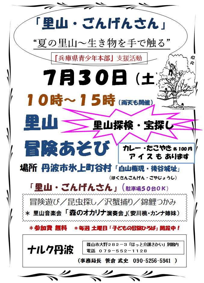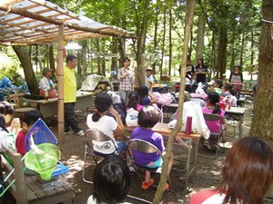 | 「丹波ごちゃまぜ自然体験〜2011夏〜」 ナルク丹波 国の青少年白書によると、「子ども達の自然体験が年々減少している。 特にキャンプをしたことが無い52%。川で魚を捕ったことが無い40%。 蝶やトンボ、バッタなどを手で触ったことが無い34%。 自然体験をする機会の多い子どもは自律性・積極性・協調性が身についている者が多い傾向にある」という。「ナルク丹波」の出番です。 と言うわけで、7月23(土)〜24(日)地域の子ども会に自然体験の場を提供した。 |