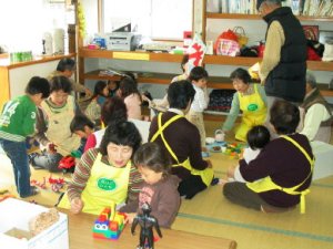 平成25年 1月11日6名参加、2〜3歳児15名を。5月20日8名参加、2〜3歳児8名を無邪気なに遊ぶ子どもたち、「おじいちゃん、誰のおじいちゃんなの?」と問いかける無邪気な声、真剣な視線。楽しい一日でした。