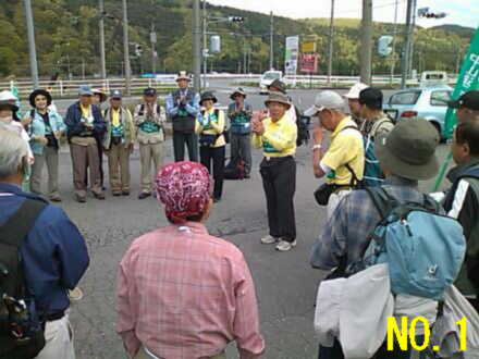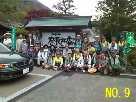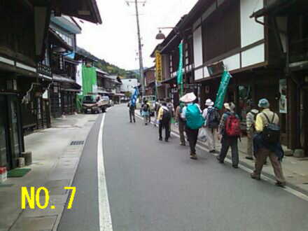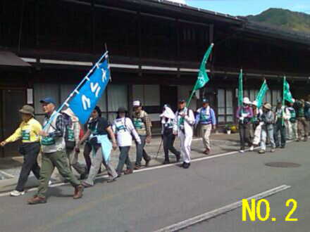 | No.1 朝のミーティングと新参加の方々の紹介 No.2 本山宿の宿場風景を見ながら歩く No.3 本山宿の一里塚跡、江戸より61里、京へ71里の表示あり No.4 これより南木曽路の碑の前で記念撮影 No.5 山が迫る深い谷あいを行く一行 No.6 平沢地区の漆工芸かねみつでサラサドウダンツツジを植樹する(かねみつの社長と高畑会長) No.7 漆器の町平沢歩く No.8 奈良井駅に到着し拠点の指導で整理体操 No.9 奈良井宿に到着し全員の記念撮影 No.10 奈良井の宿場を今日の宿に向かう |