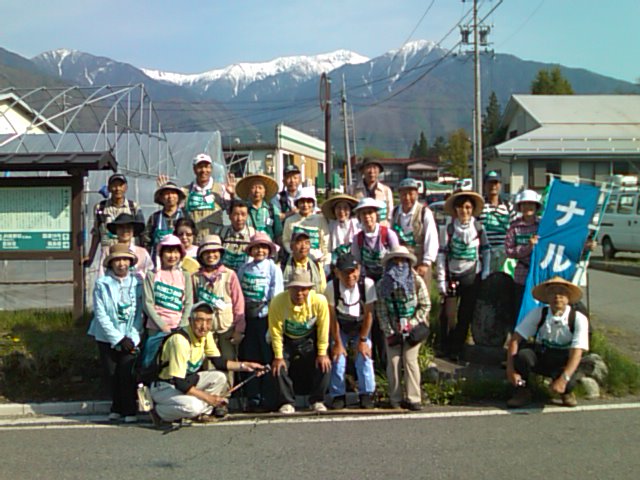中山道東西の中間地点(後方は雪をまとった中央アルプス木曽駒ヶ岳)