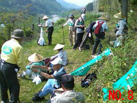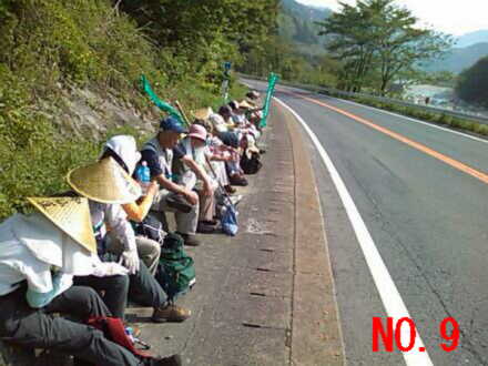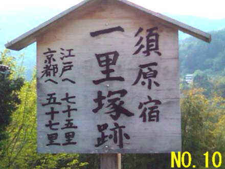 | No.1 朝から暑い木曽福島の町外れを歩く一行 No.2 狭いトンネルを抜けて新緑の森の中へ No.3 歩き初めて一時間の小休止、後ろの雪の山は木曽の御嶽山 No.4 寝覚の床での昼食風景、メインディッシュは蕎麦の実入りおじや No.5 寝覚の床を谷底まで下りた、元気集団の中の超元気者達 No.6 ウグイスの声に励まされながら、JR中央西線の線路に沿って歩く No.7 一休み中も一人元気にワラビ取りに熱中する会長 No.8 小さな峠で一休み No.9 気温31℃の国道で水分補給する一行 No.10 須原宿に到着、江戸より京都の方がずっと近くなりました |