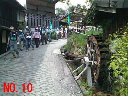 | 今朝の出発時は43名だった参加者も、午後は静岡県からの参加者が加わって67名に膨れ上がり大集団の行進に、道行く人や車の運転手それに畑や庭にいる人も何事かと言う目で見ています。 各地の人達がひとつの絆でつながっている様子に、ナルクのパワーを感じます。 No.1 信濃路に入ってから恒例になった朝のストレッチ、皆さん片足立ちもOKです。 No.2 宿泊先のあてら荘の前で朝の集合写真 No.3 松本平拠点の皆さん、下諏訪宿から明日岐阜に引き継ぐまで7日間に渡って、的確な案内と心のこもったお接待を本当にありがとうございました。 No.4 今日も暑い日差しの中をスタート No.5 日差しを避け木陰で水分補給、拠点の的確な判断で熱中症も皆無です No.6 午後から参加された方達の紹介風景 No.7 松本平拠点の案内で南木曽付近の竹林を歩く一行 No.8 妻籠城址から眺めた谷間の妻籠宿の町並み No.9 暑い中あえぎながら登った妻籠城址で一休み、強者どもの夢の跡を想う No.10 水車が迎える妻籠宿に到着、何か懐かしさを感じる風景です。 |