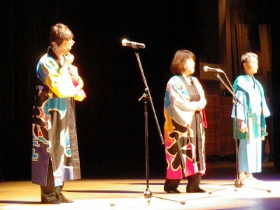 | 歌手 高橋樺子さんの歌に 合わせて仮設住宅からの 招待者会場が一つになった |